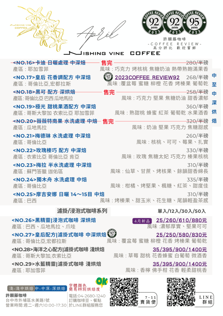 許願藤咖啡4月最新豆單-中至中深烘焙