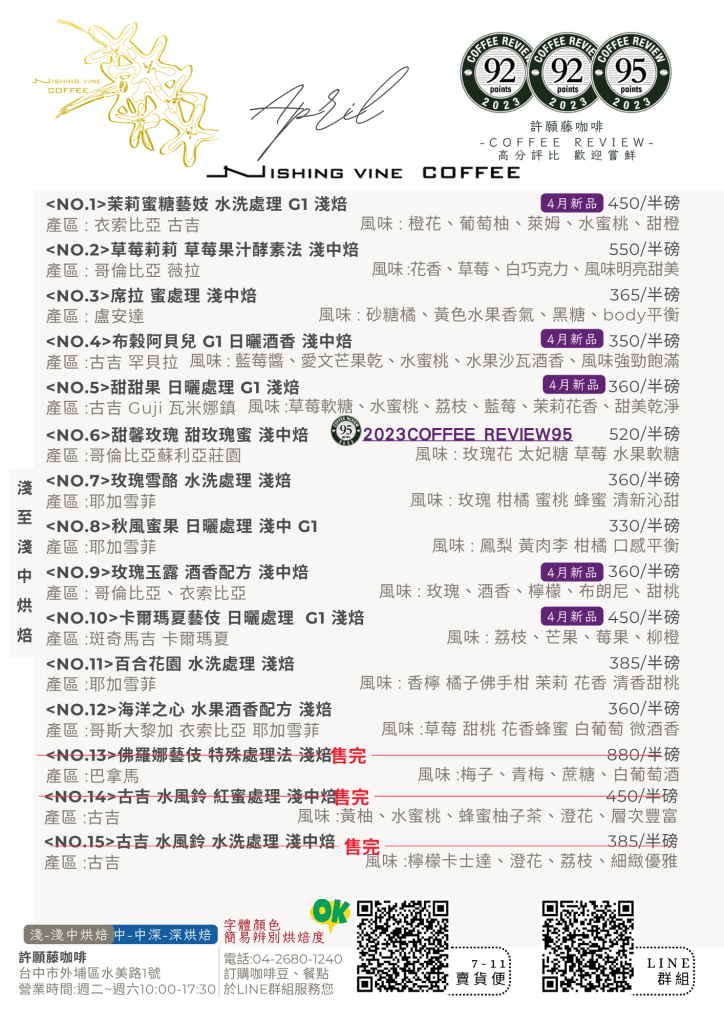 許願藤咖啡4月最新豆單-淺至淺中烘焙